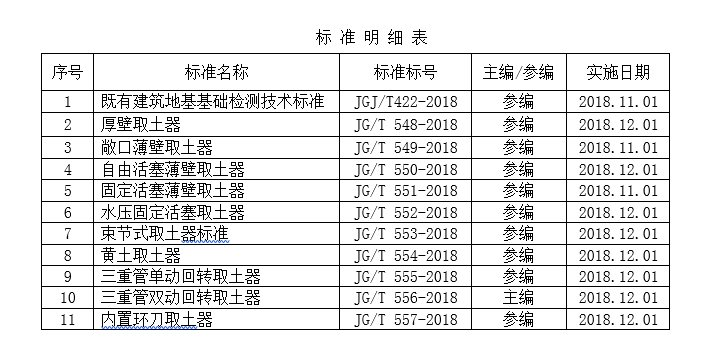 近日,國(guó)家住房和城鄉(xiāng)建設(shè)部發(fā)布公告,批準(zhǔn)我公司主編的建筑工業(yè)行業(yè)產(chǎn)品標(biāo)準(zhǔn)《三重管雙動(dòng)回轉(zhuǎn)取土器 JG∕T 549-2018》、參編的《既有建筑地基基礎(chǔ)檢測(cè)技術(shù)標(biāo)準(zhǔn)JGJ/T422-2018》等共十一項(xiàng)標(biāo)準(zhǔn),正式發(fā)布實(shí)施。