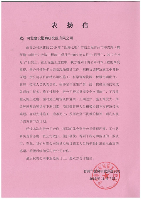 我公司承建的2019年“四路七街”市政工程晉州市中興路(魏征街-向陽街)改造工程,在施工過程中,項目部精心組織策劃,科學調配資源,主動認真負責,始終堅守在生產第一線,確保了工期、質量、安全,順利實現了業主的節點計劃,得到了業主和監理的一致認可,為晉州的后續市場開拓出了新局面。