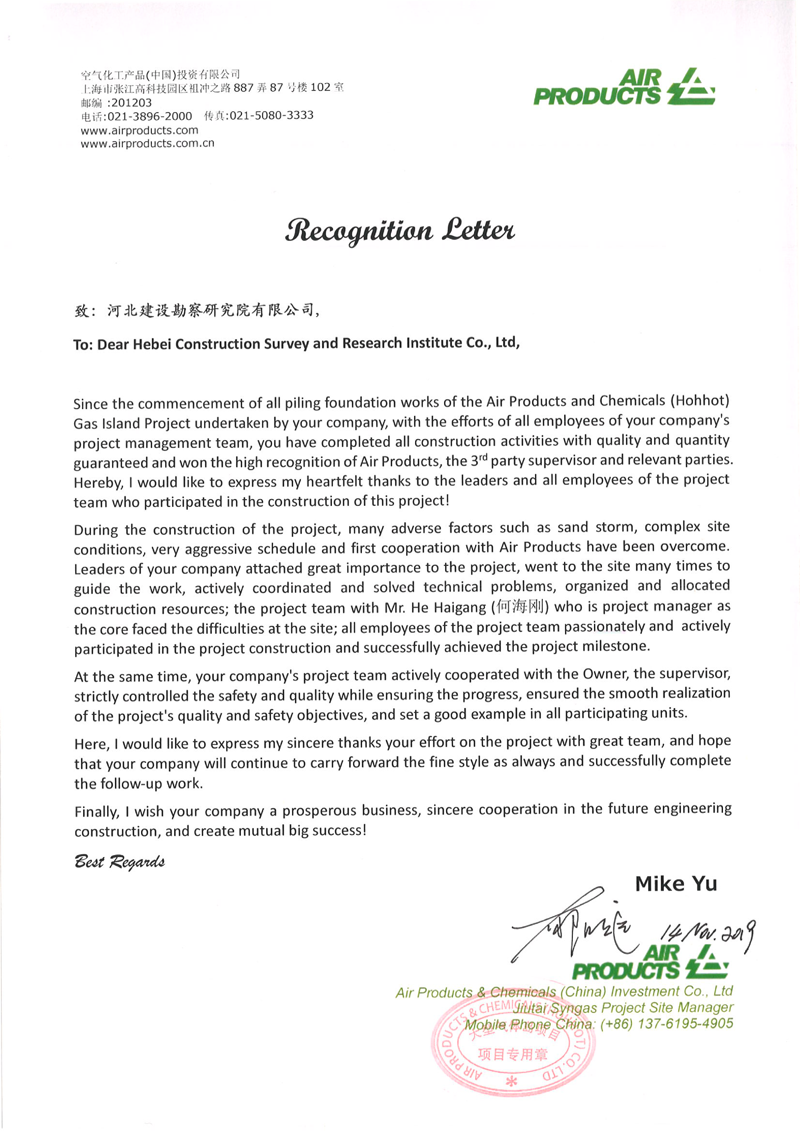 公司收到美國AIR PRODUCTS 公司表揚信
