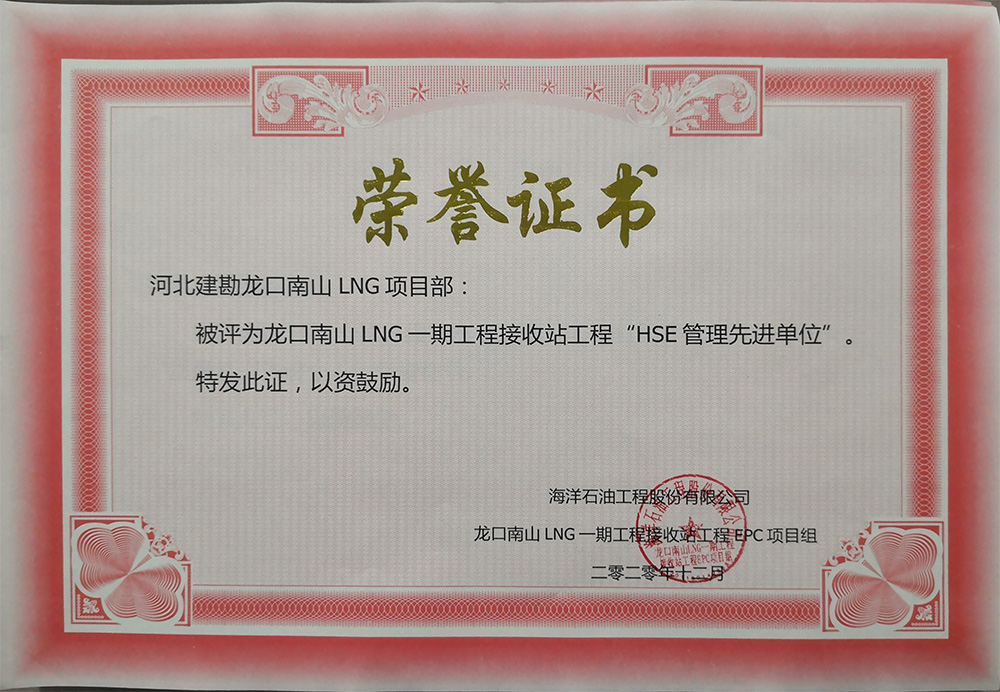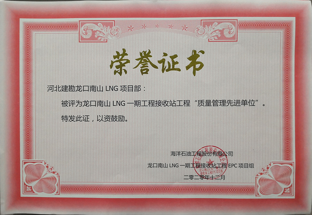 2020年12月,公司收到海洋石油工程股份有限公司發來的表揚信,對我公司在龍口南山LNG一期工程接收站工程EPC項目儲罐樁基工程標段一施工過程中,面對施工現場地質情況復雜、新工藝、施工難度大、氣候炎熱多雨、新冠疫情、人材機緊缺等不利因素,按合同要求順利完成了一標段1#和2#儲罐3497根振沖碎石樁和720根樁柱一體化灌注樁全部施工任務,給予了高度認可和好評,并表示感謝!我公司被評為“質量管理先進單位”和“HSE管理先進單位”并頒發了榮譽證書,同時對先進個人頒發了“優秀項目管理者”、 “HSE管理先進個人”、 “質量管理先進個人”榮譽證書。