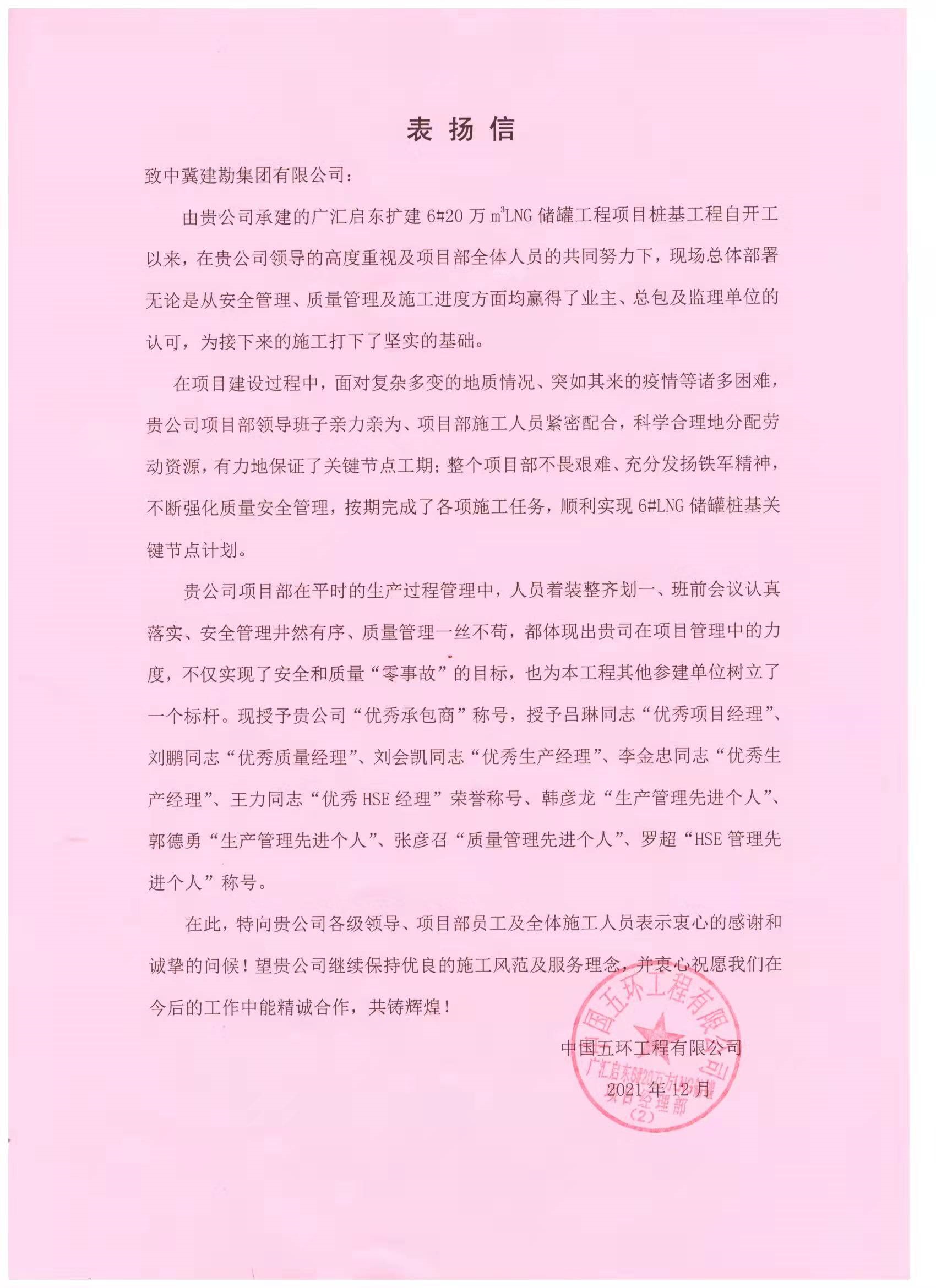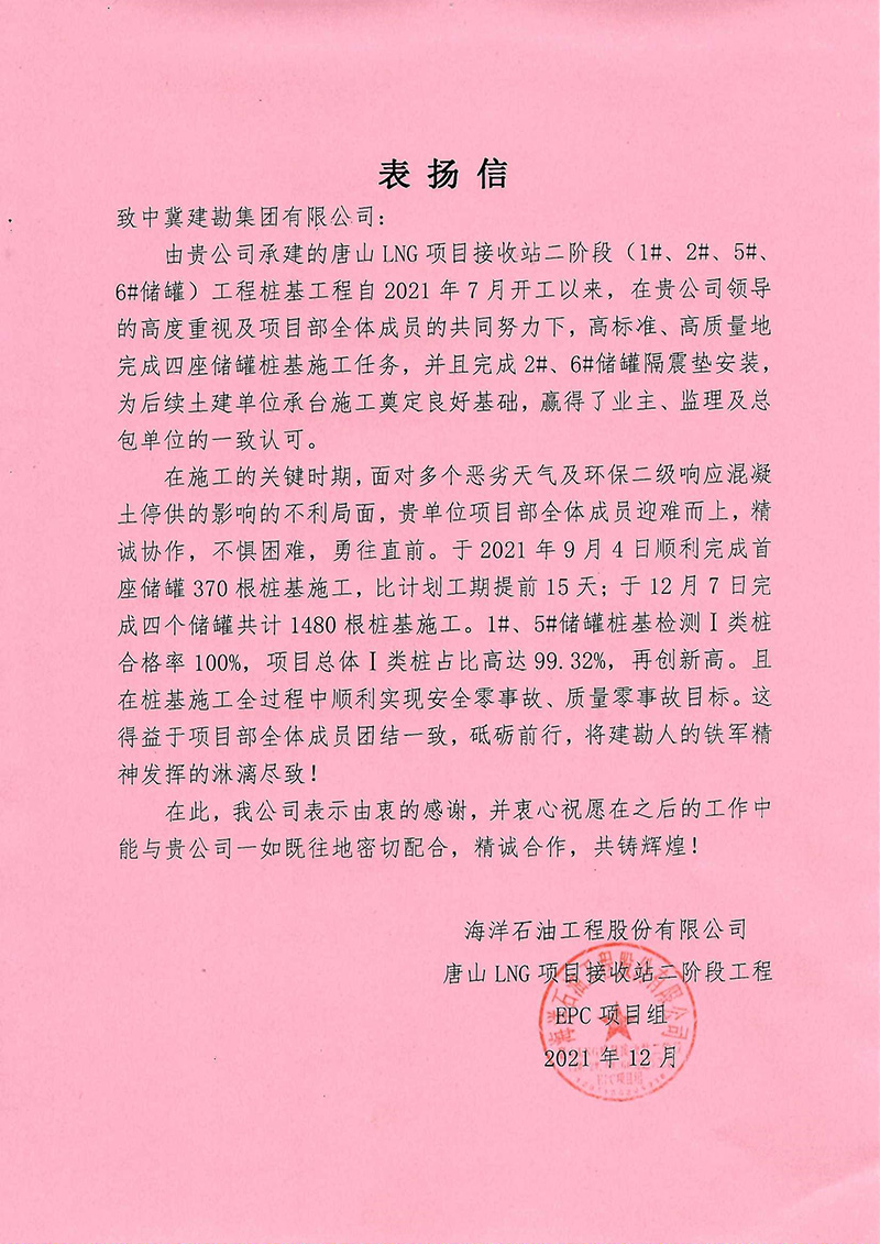唐山LNG項目接收站二階段工程樁基工程項目部建設規模為4座20萬m³LNG儲罐,項目順利實現質量零事故、安全零事故目標,贏得總包、監理及業主的一致認可與高度肯定。