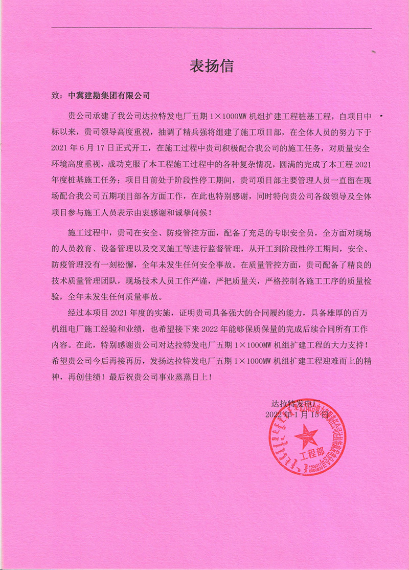 近日,由我公司承建的達拉特發電廠五期1×1000MW機組擴建項目樁基工程,收到達拉特發電廠工程指揮部發來的表揚信,對我司承接的樁基施工質量、安全文明施工、進度管控及各方面的配合表示認可。