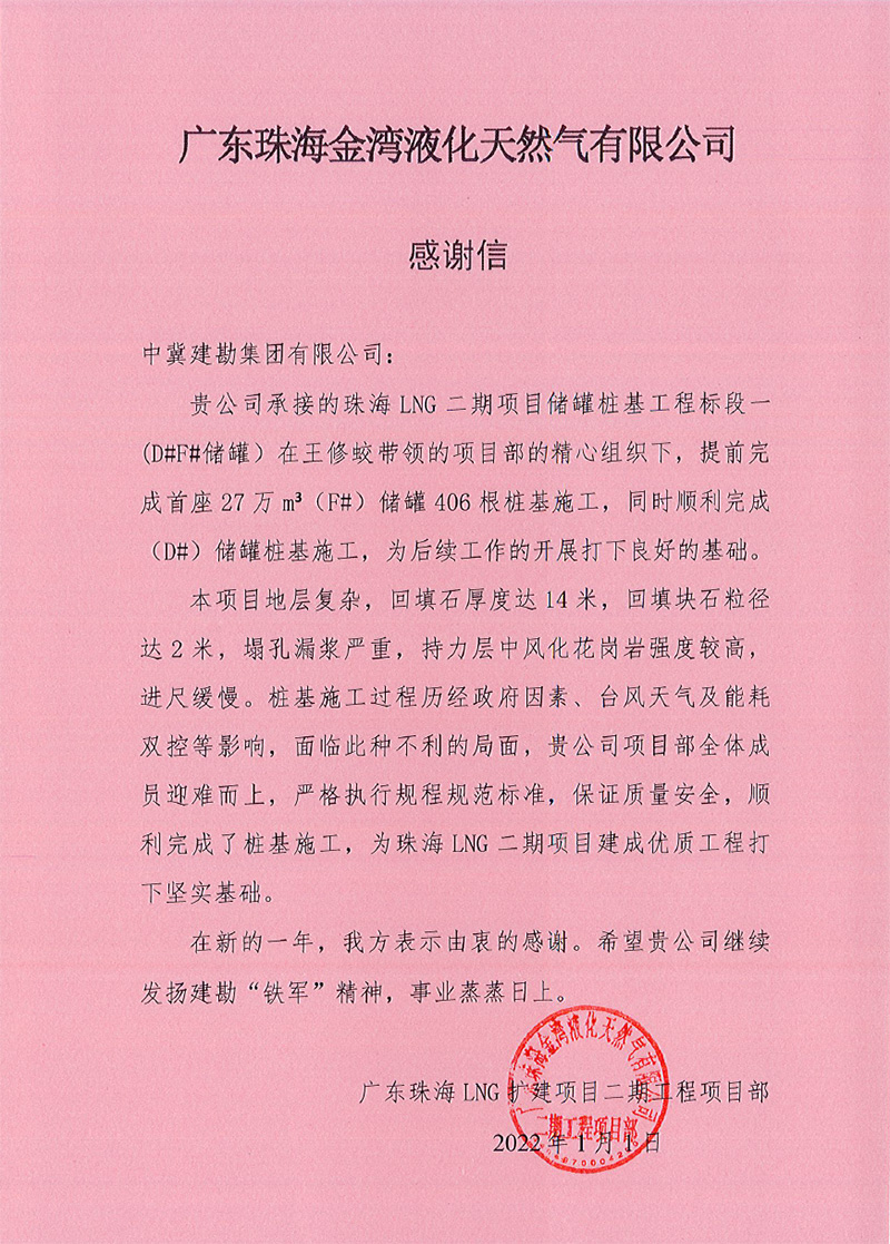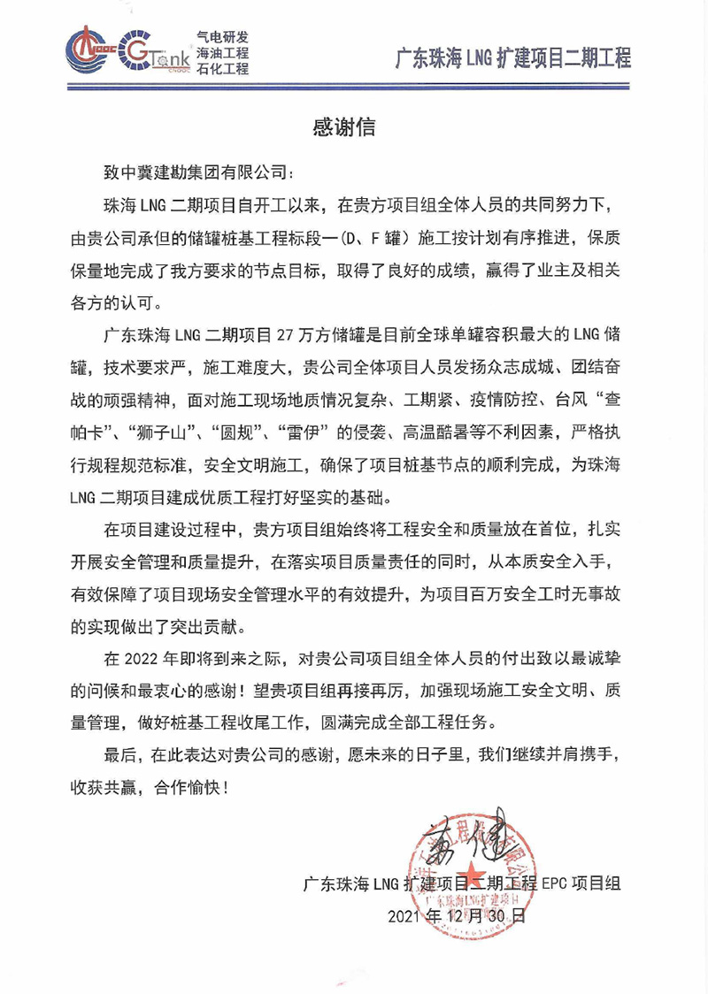 廣東珠海LNG二期項目27萬方儲罐是目前全球單罐容積最大的LNG儲罐,技術要求嚴,施工難度大。在施工工過程中,全體項目人員發揚眾志成城、團結奮戰的頑強精神,面對施工現場地質情況復雜、工期緊、疫情防控、臺風“查帕卡”、“獅子山”、“圓規”、“雷伊”的侵襲、高溫酷暑等不利因素,迎難而上,頑強奮戰,保質、安全、高效地履行合同任務,確保了項目樁基節點的順利完成,為珠海LNG二期項目建成優質工程打好堅實基礎,為項目百萬安全工時無事故的實現做出了突出貢獻,受到業主及總包方的高度贊揚。
