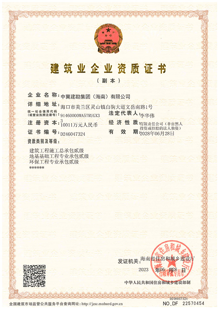 在集團(tuán)公司領(lǐng)導(dǎo)的運(yùn)籌帷幄下,2023年6月28日海南省住建廳通過(guò)了中冀建勘集團(tuán)(海南)有限公司建筑業(yè)企業(yè)資質(zhì)升級(jí)申請(qǐng),順利取得建筑工程施工總承包貳級(jí)、地基基礎(chǔ)工程專業(yè)承包貳級(jí)和環(huán)保工程專業(yè)承包貳級(jí)資質(zhì)。
