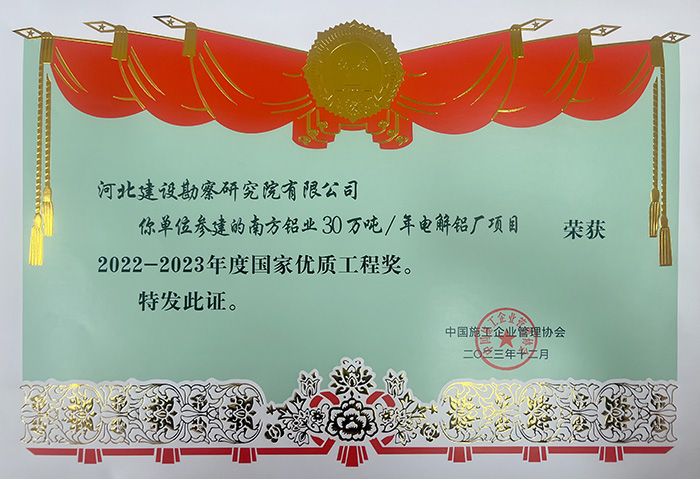 近日,根據國家優質工程獎評選辦法,我公司參建的《南方鋁業30萬噸/年電解鋁廠》項目,榮獲2022-2023年度國家優質工程獎。