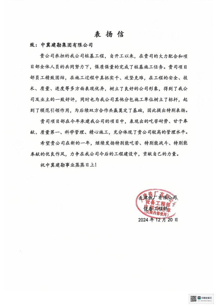此外,我公司參與的新疆農六師鋁業CFG樁項目、內蒙古庫布齊沙漠鄂爾多斯中北部新能源基地光伏項目、深能保定西北郊熱電廠樁基礎工程等多個國內外項目收到業主單位表揚信,對我公司在項目中的高效執行、嚴謹管理和出色的團隊協作表示衷心感謝,并希望未來繼續與我公司保持緊密合作。